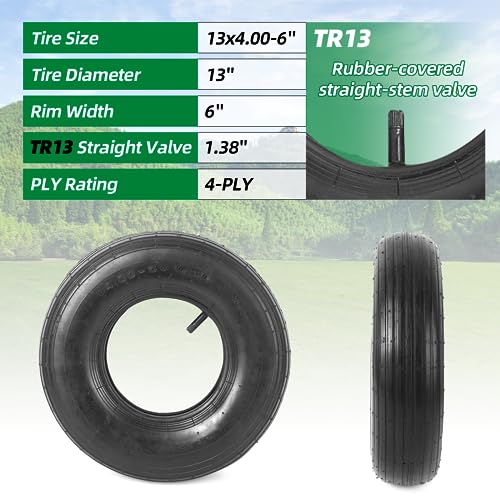 UNIVERSAL FIT 13” TIRE AND INNER TUBE – Check your existing tire’s sidewall for the required tire size. The tire size should either be 4.00-6” or 13×4.00-6”. The tire diameter is 13 inches and mounts on a 6-inch rim