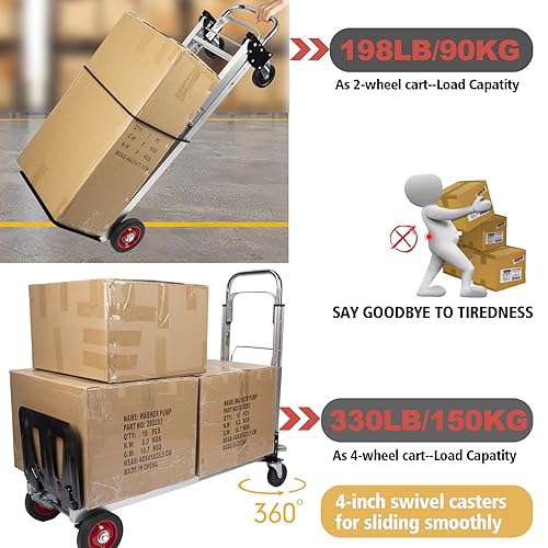 【330LB Capacity】2 in 1 Convertible Hand Truck can be used as an upright two-wheel hand truck or a horizontal four-wheel platform truck. The Load Capacity is 330LB as 4-wheel cart; and 198LB Load Capacity as 2-wheel hand truck. Folding hand truck dolly cart aluminum comes with 2 bungee cords secures the loads to the folding dolly cart 4 wheels.