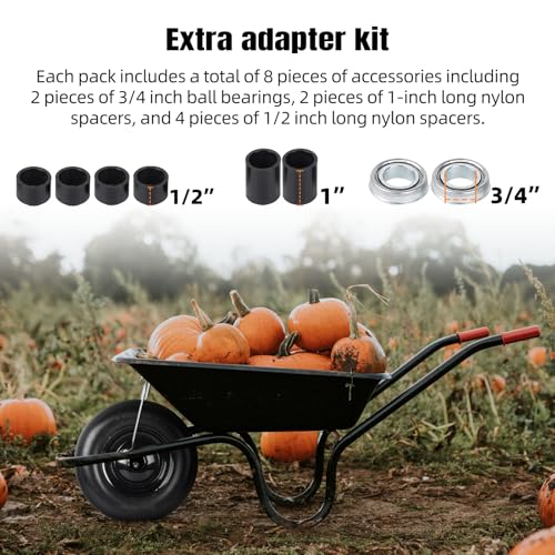 FREE ADAPTER KIT WITH 3/4″ BEARINGS AND NYLON SPACERS – (1 PACK) 4.80/4.00-8″ flat free tires, Each pack includes a total of 8 pieces of accessories including 2 pieces of 3/4 inch ball bearings, 2 pieces of 1-inch long nylon spacers, and 4 pieces of 1/2 inch long nylon spacers.