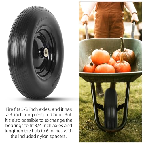 FLAT-FREE TIRE WITH 3″ CENTERED HUB LENGTH FITS 5/8″ AXLES – This tire fits 5/8 inch axles, and it has a 3-inch long centered hub. But it’s also possible to exchange the bearings to fit 3/4 inch axles and lengthen the hub to 6 inches with the included nylon spacers.