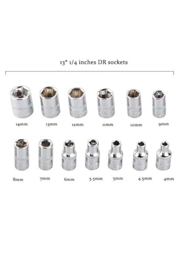 Tools Product Specifications: 13pcs 1/4 inches dr sockets: 4, 4.5, 5, 5.5, 6, 7, 8, 9, 10, 11, 12, 13, 14mm 21pcs dr bit sockets: ph 1, 2, 3, pz 1, 2, 3; fd 4, 5.5, 7; hw 3, 4 , 5, 6 , 7, 8; t 10, 15, 20 , 25, 30, 40 2pcs 1/4 inches dr extension bars 1pcs 1/4 inches dr quick ratchet 3pcs hex key wrenches: 1.5, 2, 2.5mm 1pcs 1/4 inches dr universal joint 1pcs 1/4 inches dr sliding bar 1pcs 1/4 inches dr flexible extension 1pcs 1/4 inches dr spinner handle 1pcs bit adaptor 1pcs blow case package