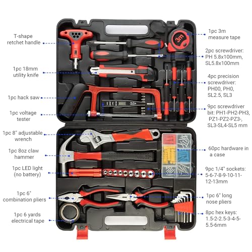 Includes- 1pc T-shape ratchet handle, 1pc 3mtr measuring tape, 2pc screwdriver (PH 5.8x100mm, SL5.8x100mm), 1pc 18mm utility knife, 9pc screwdriver bit (PH1 – PH2 – PH3, PZ1 – PZ2 – PZ3, SL3 – SL4 – SL5 mm), 1pc bit adapter, 4pc precision screwdriver (PH00, PH0, SL2.5, SL3), 1pc hack saw, 1pc voltage tester, 1pc 8″ adjustable wrench, 1pc 8oz claw hammer, 1pc LED light (no battery), 9pc 1/4″ sockets (5 – 6 – 7 – 8 – 9 – 10 – 11 – 12 – 13mm), 1pc 6″ combination pliers, 1pc 6″ long nose pliers, 1pc 6 yards electrical tape, 8pc hex keys (1.5 – 2 – 2.5 – 3 – 4 – 5 – 5.5 – 6mm), 60pc additional hardware in a case