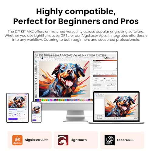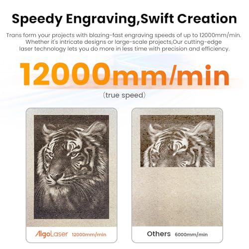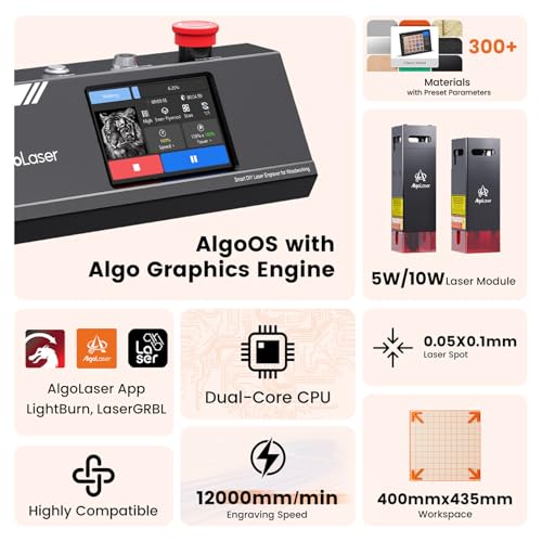 Wide compatibility: In addition to the built-in Algo OS control screen, the laser engraving machine is also compatible with AlgoLaser APP, LaserGRBL, LightBurn. It supports 2.4G wifi and USB-C links. The engraving file format supports jpg, svg, png, bmp, G code, dwg, etc.