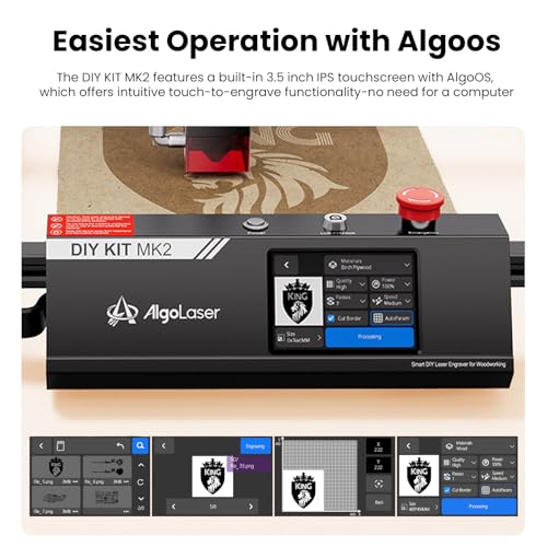 Super easy to use: AlgoLaser DIY KIT MK2 10W laser cutter and engraver machine has a 3.5” color LCD touch screen, which is easy to operate, just like using a mobile phone. Beginners do not need to spend time learning to debug complex professional software, and can easily get started and experience the fun of engraving.