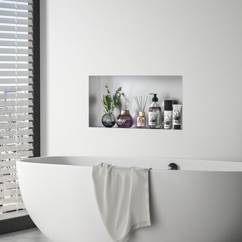 【Size】 24″ stainless steel shower niche brushed. Inner size: 24″ Width x 12″ Height x 3.94″ Depth. Install either horizontally or vertically to best suit your shower. After installation, tiles are flushed with niche flange.