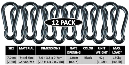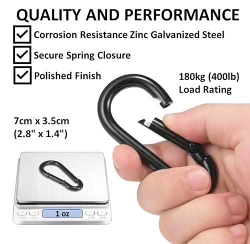 Black & Silver Heavy Duty Carabiner Snap Hooks with spring gate action for making quick attachments. Corrosion Resistant Zinc Galvanized Steel Carabiner Clip. Carabiner Snap Hooks are Great for Ropes, Chains, Straps, Backpacks, Key Ring, Camping, Hiking, Walking, Travel, Fishing, Home, Dog Leash, Indoor, Outdoor, Equipment, Gear, Tools, Gates, Gym, Hammocks, Water Bottles, etc.