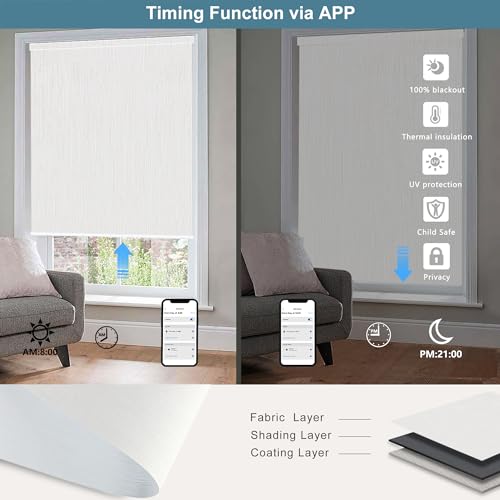 [100% BLACKOUT MATERIAL]effectively block sunlight, protect your privacy, and customizable in size and color to meet different decoration needs. quiet motor design, operates silently, and can be set with timed switch via the app, weather temperature control, go home/away automatic switch functions, bringing you a comfortable and quiet living experience.