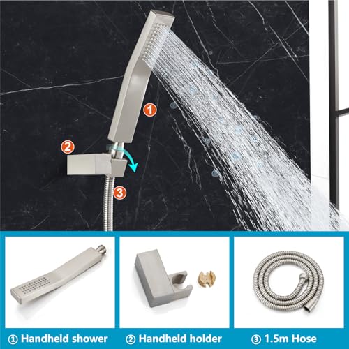 【Easy To Install】:Wall mount with 2 installation hole, come with installation instruction.The hand-held hose is 1.5 meters long which can meet the needs of people of different heights,Installation hole distance is 5.9 inch (15cm) .Our connectors are standard 1/2 NPT threads, compatible with most existing shower systems.