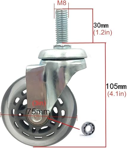 ★Dimensions and weight: caster diameter 75 mm, tire edge width 24 mm, threaded rod length is 30 mm, installation height 105 mm, 3 different sizes of threaded rods: M8, M10, M12. A single wheel can load 45 kg.