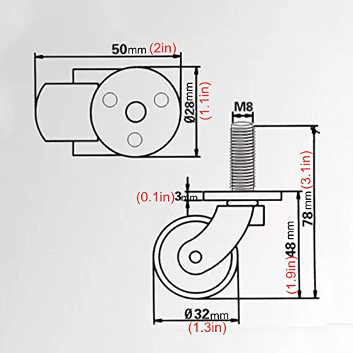 Size and load bearing: M8 threaded rod caster diameter: 32 mm/1.3 inches, threaded rod height: 30 mm/1.2 inches, disc diameter: 28 mm/1.1 inches, installation height: 48 mm/1.9 inches, total height: 78 mm /3.1 inches, load: 150 kg/330 pounds.