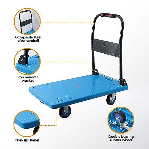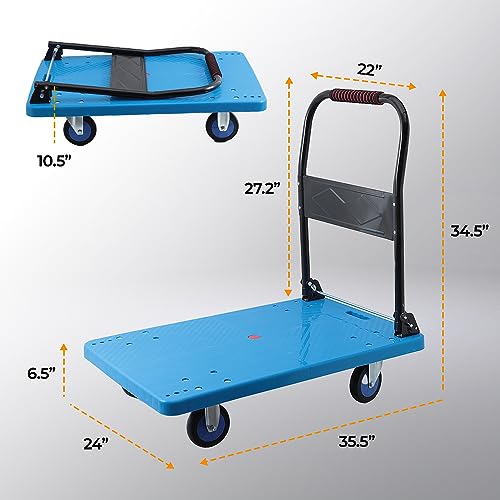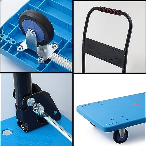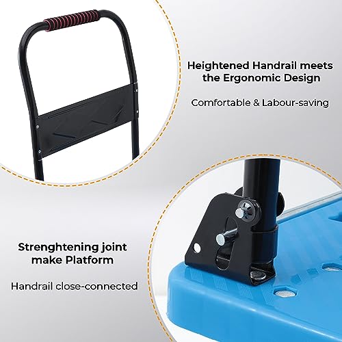 FOLDABLE TROLLEY: It functions as a push dolly cart and can be easily folded for storage when not in use. The cart can be folded and used easily in 3 seconds, just by stepping on the track. Take it in the car, or store it in the garage.