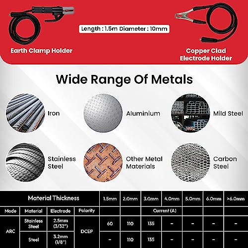 COMPLETE ACCESSORIES INCLUDED: The package includes essential accessories such as a 1.5-meter electrode holder (25mm mark 30mm) with a 500A capacity, a 1.5-meter earth clamp (25mm mark 30mm) with a 500A capacity, a brush for cleaning, a hand-held shield for protection, and five welding rods measuring 5.0mm in diameter.