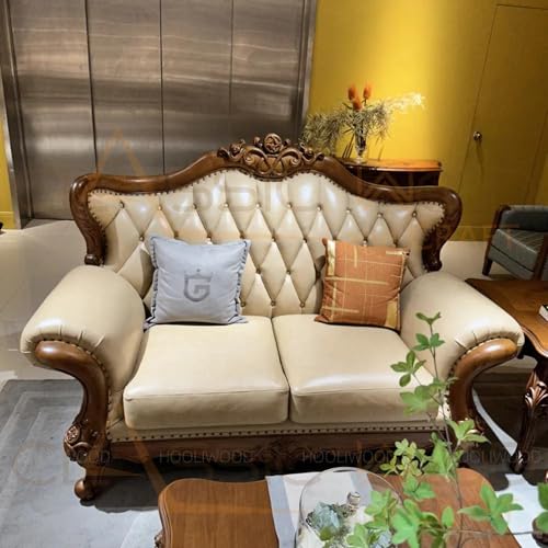 Elegant Design: Hand-carved wooden accents bring a touch of royalty to your living space, inspired by classic Maharaja styles. Luxurious Comfort: Features tufted upholstery in a creamy beige color that enhances the comfort and aesthetic appeal.
