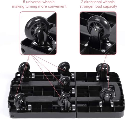 7pcs detachable silent anti-friction skateboard wheels together with inner carbon steel bearing for more stable operation: 5pcs 360° rotating back wheels allowing you to push and pull freely; 2pcs directional front wheels to keep the cart balanced and makes this weight moving platform stable. Thereby the flatbed reduce the weight on the handle and spend little strength moving things easily