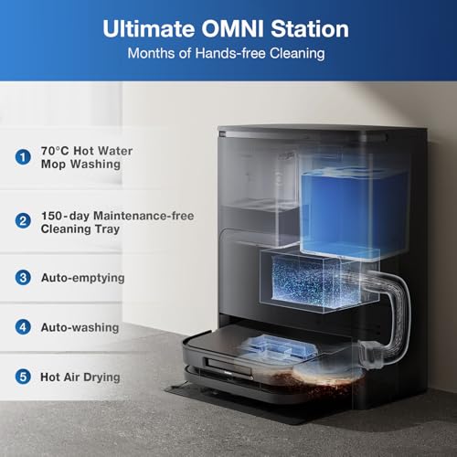 12-IN-1 OMNI STATION: The upgraded OMNI station cleans the mop with hot water (3 adjustable temperatures) and dries it at 63°C. It detects dirt levels and re-cleans as needed while optimizing water usage.