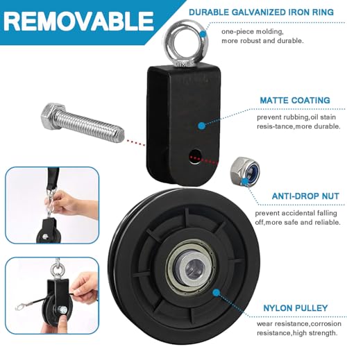【WIDE APPLICATION】Simple and practical pulley,can be used for home gym pulley system, DIY Home Projects, gym Equipment, clothesline, hoists, lifting blocks, ladder lift, shop lifts, etc.Every family likes to buy, a pulley can meet the needs of customers in many ways.Easy installation,easy to use,it can save your precious time and labor, making you enjoy more fun.Workable with rope or cord indoor and outdoor for flexible sliding pulley,to hang weight things or lighten load.