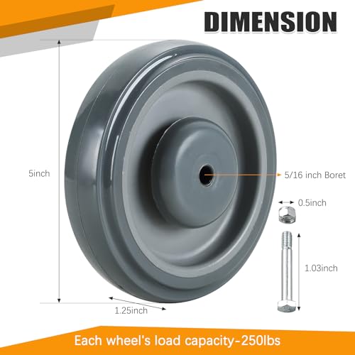 Perfect Size Design: The Cart wheels with a diameter of 5 inches , a width of 1.2 inches, and bore with (5/16″). We have included 8 bolts(Four installed on the products) and nuts for your convenience. The shopping Cart wheels can withstand most chemicals, solvents, acids and oils, without fear of any environment, giving you a perfect experience.