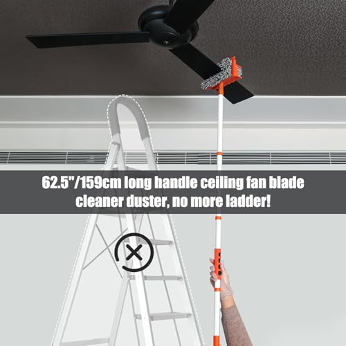 【62.5’’ Detachable Long Handle Fan Blade Duster】Use a chenille (gray-colored) mop to clean fan balde. Up to 62.5’’/159cm long, 8” wide fits most indoors ceiling fan balde. No more ladders or chair to clean your ceiling fan! Also for those hard to reach spider webs in the corner ceiling areas