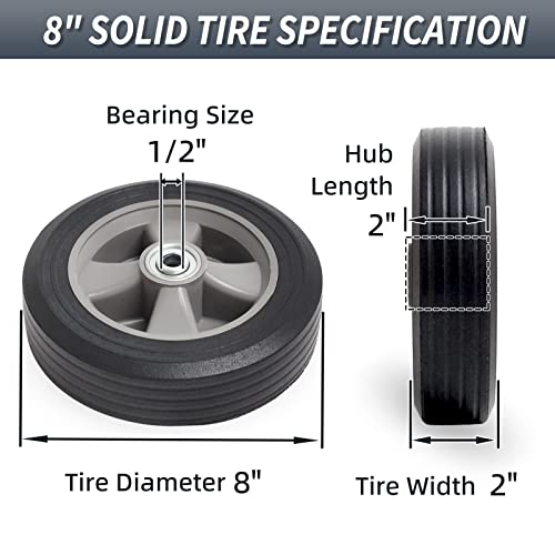HEAVY-DUTY SOLID RUBBER TIRE: These flat-free tires are made from premium hard rubber materials have high resistance to impact cracks. Our tires are perfect for heavy-duty material handling hauling and transporting applications with a maximum load capacity of 400 LBS