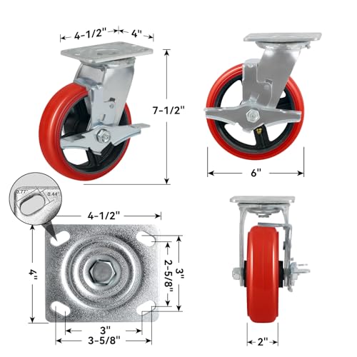 CASTER SIZE: Industrial caster diameter: 6 inches, width: 2 inches, top plate: 4x 4-1/2, total height: 7-1/2, These casters were designed with strength and sturdiness in mind for a long lifespan and Strong Load, heavy loads. Each caster holds up to a maximum of 1200 lbs. or 4800 lbs when purchasing a set of 4 casters.