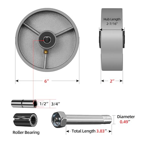 WHEEL SIZE: Wheel diameter: 4,5,6,8 inches, width: 2 inches, Hub Length: 2-7/16″,with ¾’ roller bearing and 1/2″Axle Bore. Weight capacity ranges : 4″wheel: 800 lbs. 5″wheel: 1000 lbs. 4″wheel: 1200 lbs.4″wheel: 1300 lbs.