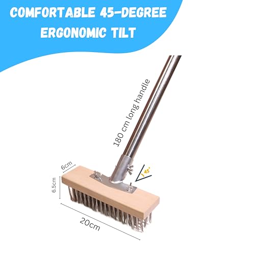180 cm long with 3 Stainless Steel Pole, 20 cm long Brush with 6.5 cm Width, and 2 inch long wire bristles for effective cleaning.