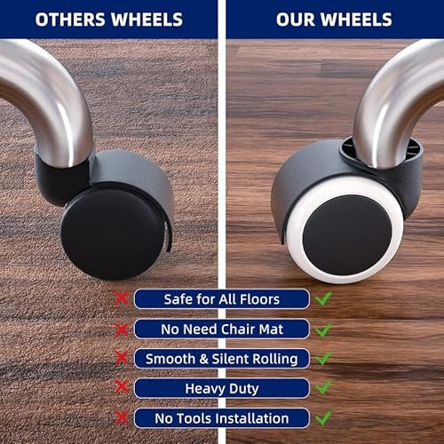 ✅5 Seconds to Install: The office chair casters heavy duty can be replaced without any tools, just pull out the old chair wheel and pop it off, then push the bar of the new desk chair wheels into the slot until it is firmly seated. It only takes 5 seconds for you to complete the operation.
