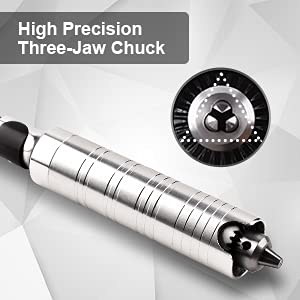 Wide Compatibility: The stable and convenient three-jaw chuck for the jewelers tools accepts accessories from 1/8″, 3/32″, 1/16″, 1/32″, 1/64″, 5/32” to enhance versatility. Attachments are easy to replace and strong clamping force holds them firmly on the flex shaft drill under high pressure.