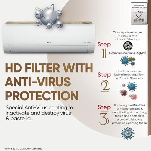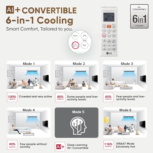 Key Features: Dual Inverter Compressor, AI+ Convertible 6-in-1, Energy Manager+, VIRAAT Mode, LG ThinQ (Wi-FI), Voice Control with amazon Alexa & Google Assistant, HD Filter with Anti-Virus Protection, HimClean, ADC Sensor, Cools at 55⁰ C, Stabilizer free operation within 120V-290V voltage range , Temperature Display type – Magic Display (LED) for temperature and timer modes, 15 MTS Airthrow; Noise Level: IDU – 31 (db) & ODU – 56 (db)