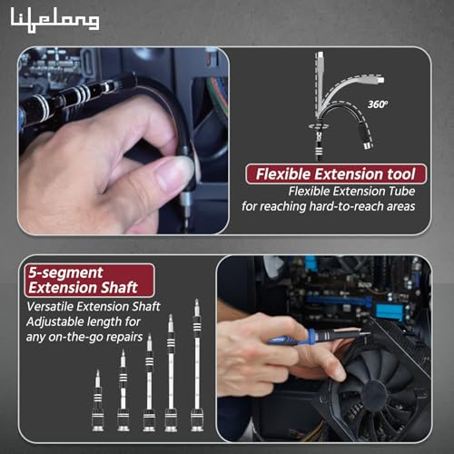 Multi-Function Kit: The Lifelong 62-in-1 electronics repair tool kit includes 58 precision bits such as Phillips, Torx, Flathead, Pentalobe, and more, along with a screwdriver handle, flexible and solid extension rods, and a 1/4-4mm driver adapter, catering to all your repair needs.