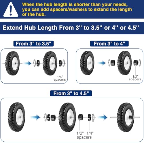 【Extra Adapter Kit】4.80/4.00-8 Flat Free Tire is pre-assembled with 3″ centered hub and 3/4″ bearing. Comes with an additional adapter kit, 4pcs 1/2″ Ball Bearing; 4pcs 1/4″ Nylon spacer; 4pcs 1/2″ Nylon spacer; 4pcs 0.08″ Zinc Washers; 4pcs 5/8″ Shims.