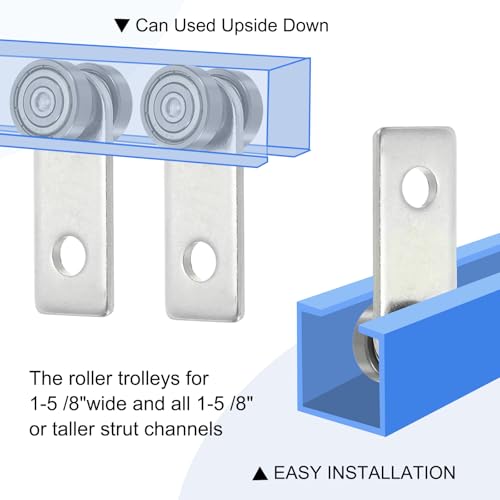 The Two Bearing Trolley Assembly fits 1-5/8 inches wide and all strut channels are 1-5/8 inches or taller. It can install ceiling cart systems, power lifts, and DIY projects.