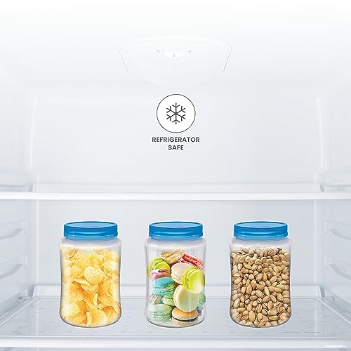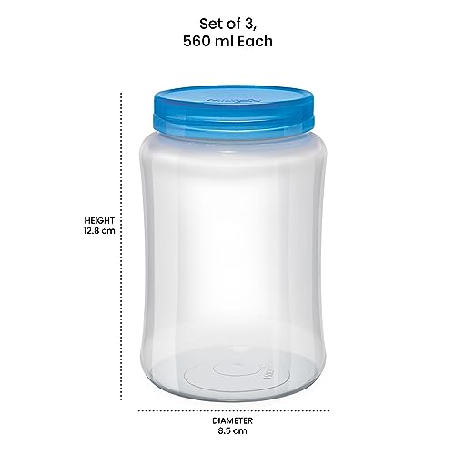 Color: Blue; Material: PET; Package Content: 3 – Piece Crisp Clear Round Jar (560 ml); Dimension in cms (L x W x H): 8.5 x 8.5 x 12.8
