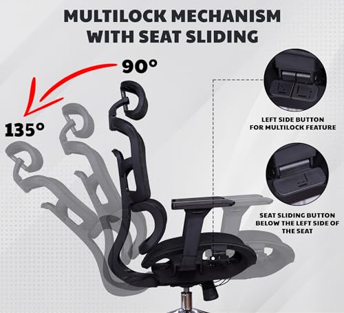 EASY RECLINE WITH MULTI LOCK FEATURE: Aero Chair comes with a Button Milti lock mechanism. A push of your finger on the Button is sufficient to adjust the seat height and reclining angle up to 135