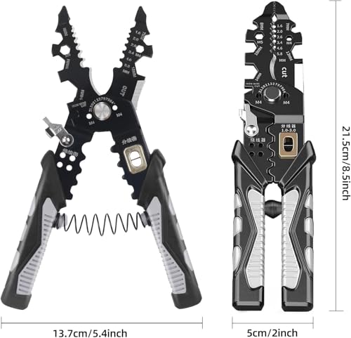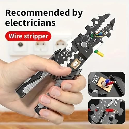 【Multifunctional Wire Stripper Tool】The latest multi-functional wire stripper in 2024, equipped with 8-inch professional wire strippers and crimping tools, can quickly and easily remove insulation from wires, making it ready to use at any time. Electrical pressure connections used for stripping and cutting copper, aluminum, sheathed cores, cables, cutting bolts, and insulated terminals.