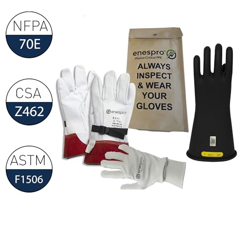 KIT INCLUDES: Pair of Class 2 Rubber Voltage Insulating Gloves; Pair of ArcGuard FR Knit Gloves; Pair of 10″ Leather Protectors for gloves; Glove bag for easy storage