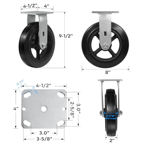 Perfect Size: 8″ X 2″ caster wheels are easy to install and won’t take up too much of your time. The heavy-duty industrial caster set of 4 has an overall height of 9-1/2″.