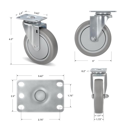 PERFECT SIZE DESIGN: Top Plate Caster Dimensions: Length: 3-5/8″, Width: 2-3/8″. Hole Spacing: 2-3/4″ x 1-3/4″. Rubber caster wheel size: 5″ X 1-1/4″. Overall height of casters: 6-1/16″. The Heavy duty caster set of 4 are easy to install and complete with accessories, so they won’t take up too much of your time.