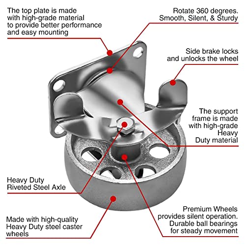 360 DEGREE ROTATE SWIVEL CASTERS: Transform the mating equipment to any directions in the most efficient and labor-saving way, our cast iron caster wheels are the best accessories for the heavy furniture, desktop, table, cabinet or trolley.