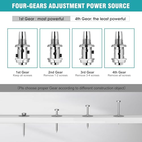 【4 Gears Power Adjustment】1st Gear: no need to unscrew the screw on the muffler, it’s the most powerful and can penetrate 4mm steel plates, can hit concrete, 2nd Gear: need to unscrew 1 screws for penetrating the red brick walls or concrete walls , 3rd Gear: need to unscrew 2 screws for penetrating the wooden boards,etc., 4th Gear: unscrew all screws to penetrate the soft wood material and brittle object ,Note: every screw on the muffler is same