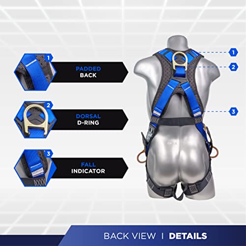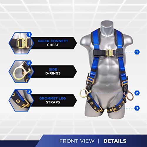 🧰 RELIABLY DURABLE – We provide fall protection gear that is built to last and can keep you out of harm’s way. The body harness is build with these physical parameters: Webbing: Polyester, Width: 1.73 in, Breaking Strength: 5000 lbs., Stitching Thread: High-tenacity polyester | Metal Component: Alloy Steel, Finish: Silver or Golden Yellow Galvanized | Weight: 4.28 lbs.
