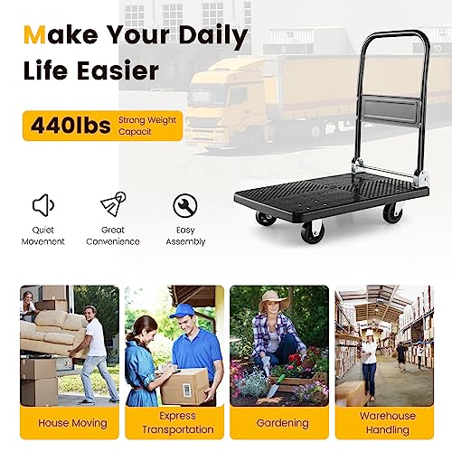 【Sturdy & Durable Structure】 This dolly cart consists of a powder-coated metal frame and thick platform, which are strong enough to bear a weight of 440 lbs. And the metal frame is rustproof as well for higher durability.