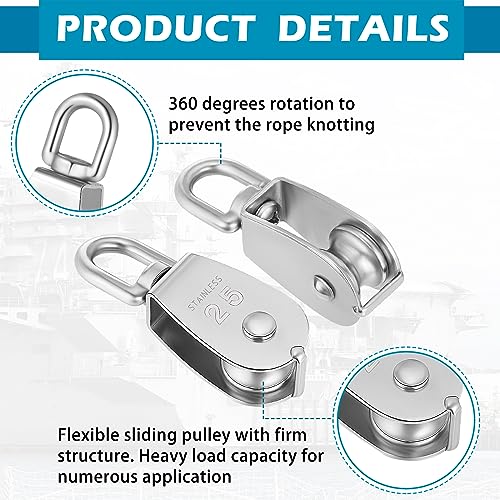 Versatile Applications: amplify your lifting, transmitting, or pulling operations using the stainless steel pulley set; With its capability of smooth sliding, it finds extensive application in pulling steel wires, ropes or other similar tools; Ideal for lifting ropes, tent fastening, industrial lifting, and high altitude operations, this pulley set offers versatility in various domains