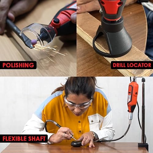🔨 ERGONOMIC & VARIABLE SPEED: Light Weight and Soft Grip enables comfortable opeartion of rotary tool for longer working hours. SIX Speedrange from 8,000 to 32,000 RPM gives better control over tasks from delicate engraving on glass to high speed cutting of hardened steel. Work on different speeds with different accessories on different surface for precise and intricate projects. It works on 220V and has 2 Pin Electric Plug.