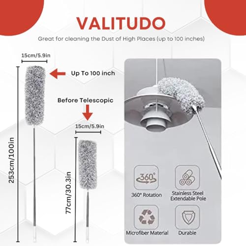 EXPANDABLE POLE- The stainless steel handle extends up to 100 inches, enabling you to clean high ceilings and tall furniture without the need for a ladder. This feature provides greater reach and flexibility, ensuring difficult-to-access areas are cleaned efficiently.
