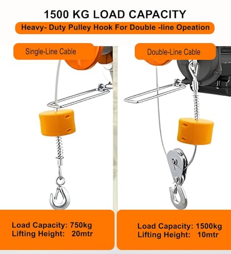 HIGH LOAD CAPACITY – Single line can carry 750kg , 32.8 feet per minute, up to 66 feet. The two-wire can carry 1500 kg, 16.4 feet per minute, and up to 33 feet. Heavy-duty, high load-bearing galvanized hook with pulley for double-line operation.