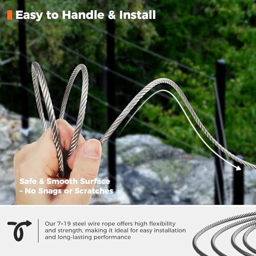 Safe and Reliable Structure: This 3/16 inch wire rope is constructed of 7 x 19 structure, 7 groups of 19 strands braided together to form the cable, a smooth surface without burrs, making you enjoy the beauty of industrial products