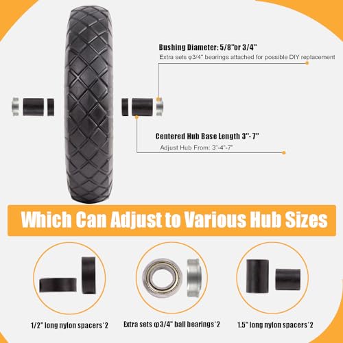 Compatible Kit: 4.80/4.00-8 flat free tires and 2 wheels. Additional adapter kit included Two 3/4 inch diameter bearings, 1/2 inch long nylon spacers * 85 inch long nylon spacers * 2, which can greatly expand the application. Easy to install for DIY enthusiasts and professional mechanics
