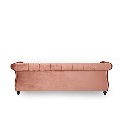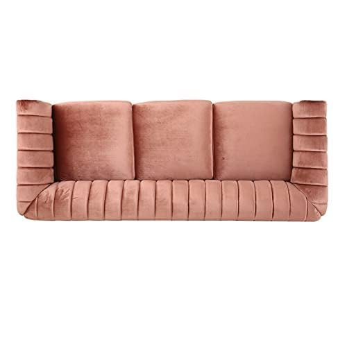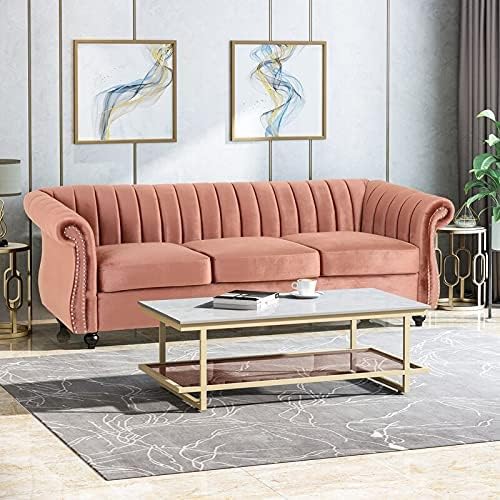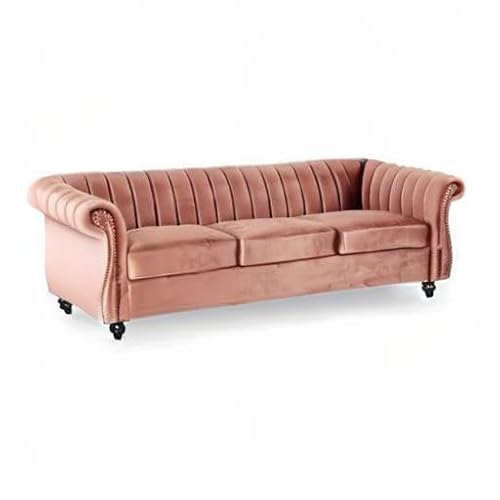 ELEGANT DESIGN: Victorian-inspired channel-tufted sofa featuring plush velvet upholstery in blush pink, with sophisticated rolled arms and decorative nailhead trim detailing